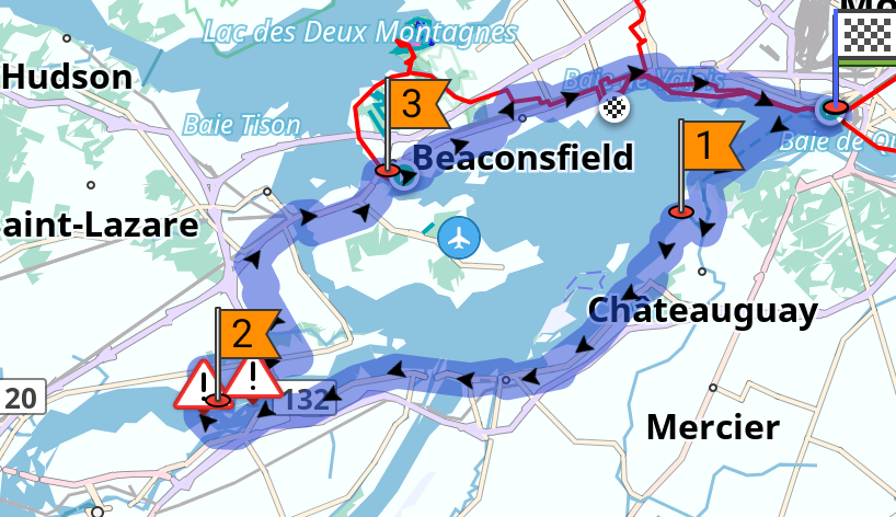 Depuis les îles, il y a un autre petit travsersier (quelques centaines de mètres et on ne réserve pas) qui nous mène aux Cèdres. De là, on traverse l'île Perrot jusqu'à Sainte-Anne-de-Bellevue. Le retour vers Lachine se fait en longeant le lac Saint-Louis.